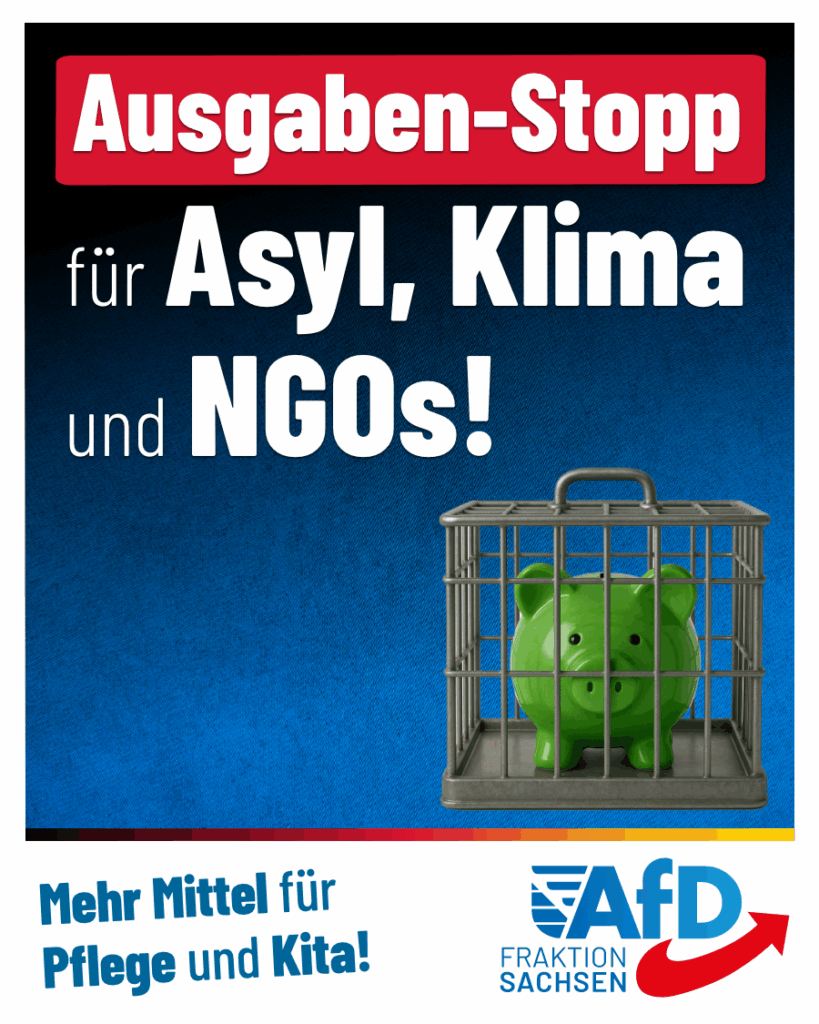 Der Freistaat Sachsen muss seine Prioritäten komplett neu ordnen. Statt Unmengen an Steuergeld für Asyl, Klima und NGOs zu verbrennen, muss die Regierung die Elternbeiträge in Kindergärten senken und die Pflege wieder für jedermann bezahlbar machen.