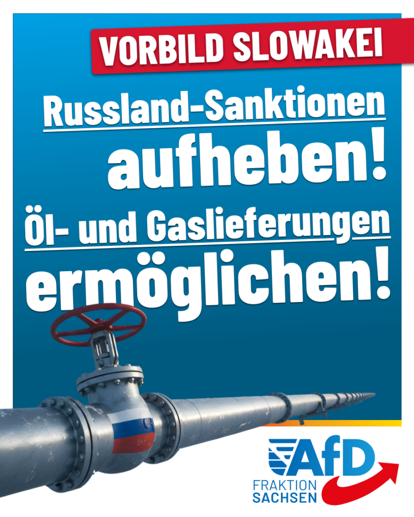 Und: Gerade in der aktuellen, schweren Energiekrise brauchen wir Öl und Gas aus Russland! Die Russland-Sanktionen müssen dafür aufgehoben werden! Neben der zügigen Reparatur der Druschba-Pipeline müssen auch die Nord-Stream-Stränge repariert werden, damit günstiges, russisches Gas direkt in Deutschland ankommen kann.