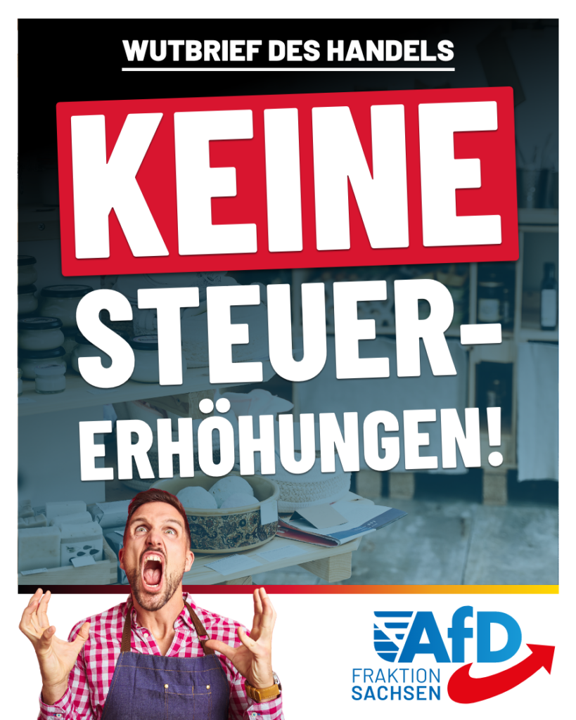 Die AfD sagt hingegen: Um die Wirtschaft und auch den Handel zu beleben, brauchen wir Steuersenkungen statt eine Anhebung der Mehrwertsteuer von 19 auf 21 Prozent.